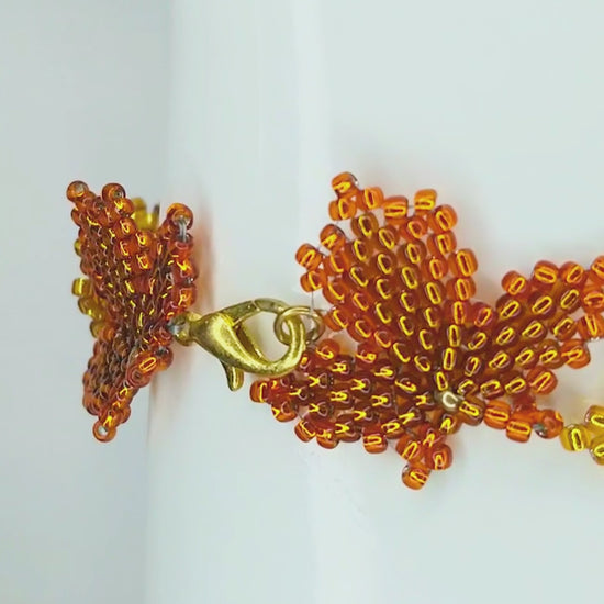 Learn how to make this beautiful autumn maple leaf bracelet with this step-by-step diagonal peyote stitch beading pattern. This unique design glows with the warm hues of fall and is the perfect beaded bracelet to enjoy throughout the fall season and the holidays. Sure to be a conversation piece, this comfortable, flat-profile beaded bracelet adds a colorful, classy touch.