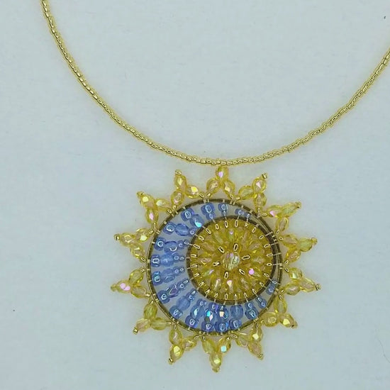 Learn how to make this dramatic and eye-catching "Sun and Moon" necklace that portrays a delicate cool blue moon in front of a brilliant yellow sun. Regardless of what meaning you have attached to these two powerful symbols, all will agree that this whimsical design is an inspirational and captivating statement piece. To make this beautiful pendant, two different-sized jump rings are used with a combination of stitching techniques. This is a more involved project compared to many of our other designs, but we show and explain each step so that beaders of all skill levels can be successful.